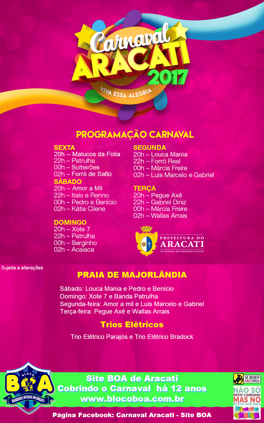 O Site BOA trás para você tudo sobre o Carnaval de Aracati 2017, como fazemos há 12 anos, informando os nossos visitantes, sempre com informações direto ta fonte e confirmadas. Então você já sabe, quando o assunto for Carnaval Aracati 2017 as informações você encontra aqui...