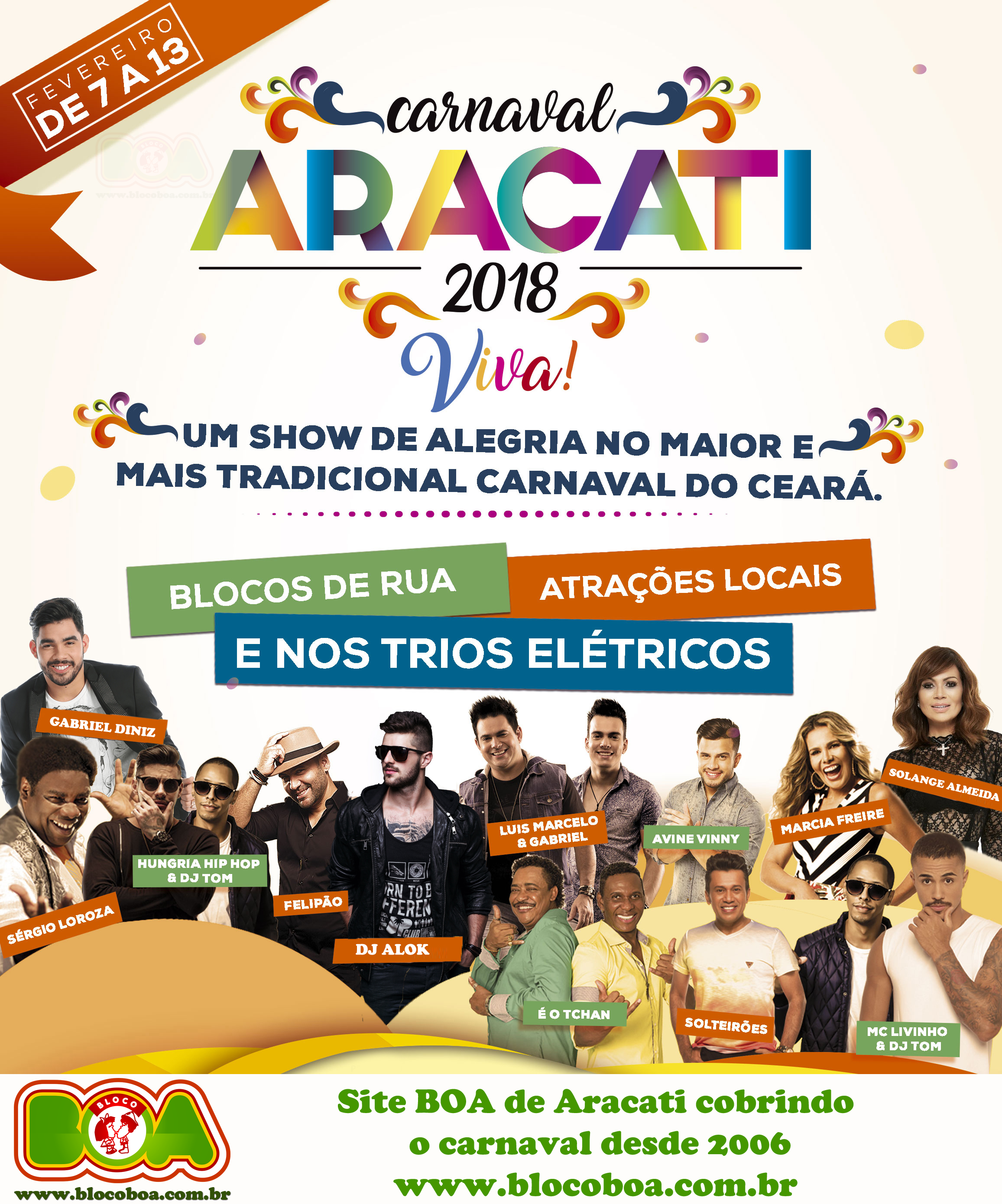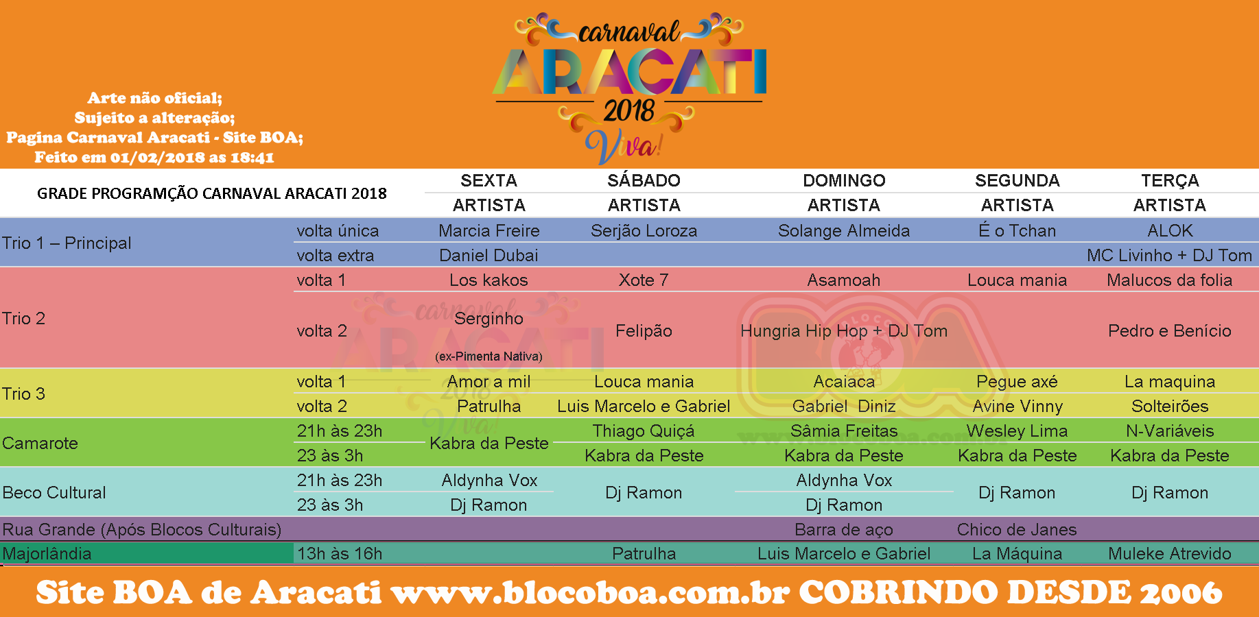 Programação do Carnaval de Aracati 2018 (sujeito a alterações), banner não oficial, a pagina Carnaval Aracati - Site BOA. como sempre, traz a informação que o folião quer saber... Parabenizamos a organização do Carnaval, pela antecedência da mídia, coisa que nunca vimos na cidade. Com certeza, acontecendo alterações, nos postaremos... Curta, compartilhe, marque seus amigos... #siteboa #carnavalaracati2018 #blocoboa2018