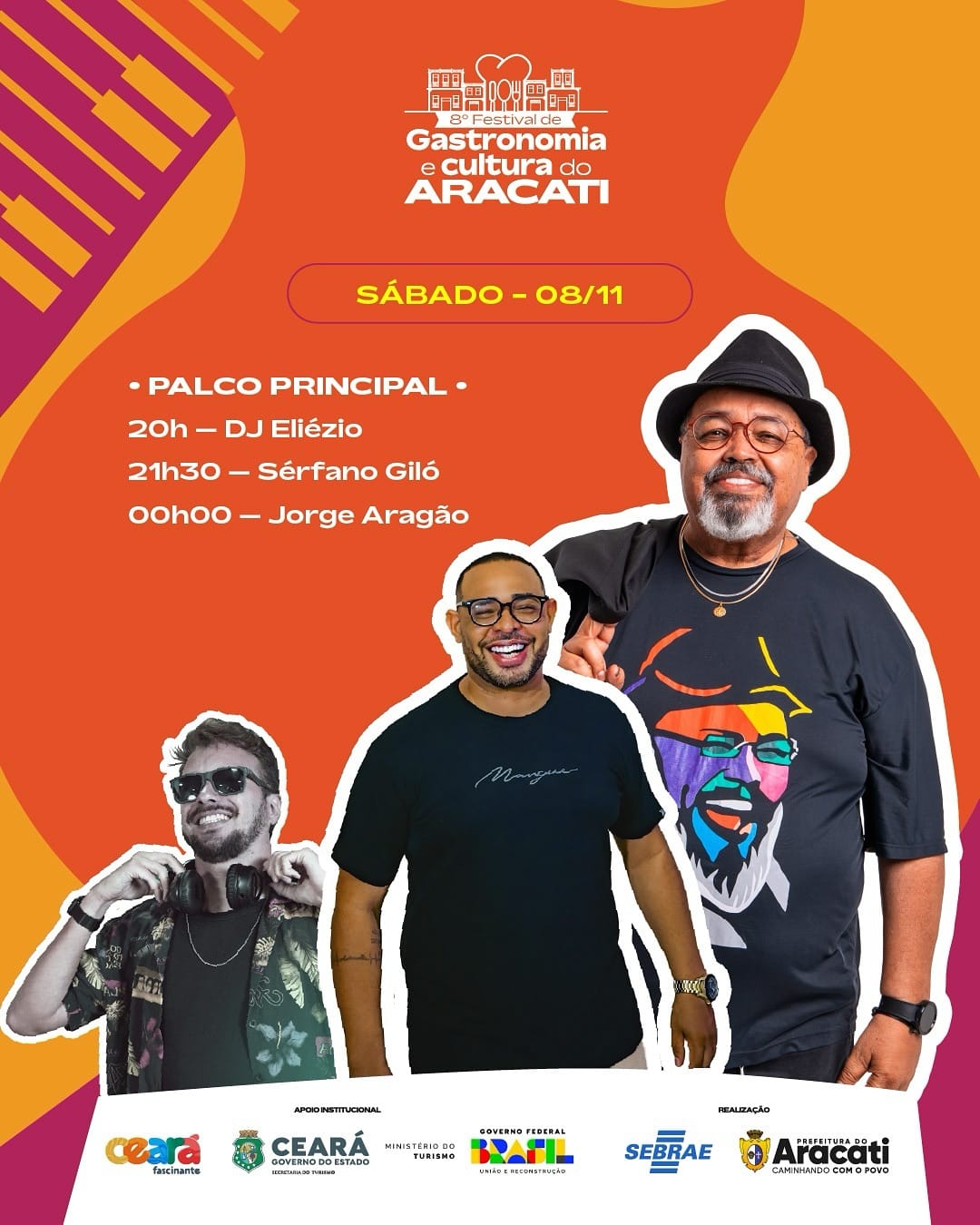 8° Festival de Gastronomia e Cultura do Aracati, show com Dj Eliézio, Sérfano Giló e Jorge Aragão e outros. - Local: Centro Histórico - Aracati-CE - Data: 08 de Novembro de 2025 - Fotos By: Michael Lima - Total de fotos: 108. Observação: Aguarde todas as fotos serem carregadas.